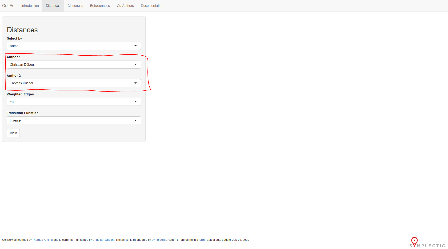 As mentioned above, the selectize functionality does not work when the app shut down and the screen turned grey. In contrast, the "Select by" (Name, RePEc Handles) dropdown menu still lists the available options. It does not trigger any computations either, but the options still show up in the browser. The reason for this difference is the way I implemented the two fields. The "Select by" field runs on the client side. It is a dropdown menu with two options not incurring any substantial computational costs. The name selection is also available through a search field on the client side, but the respective process runs on the server side. There is no need of loading 47,000 names into the user's browser and running the sorting algorithm on the client side when the user types. I tried it. It is very slow. Thus, I load the 47,000 names on the server and only export the top 20 results. These results are updated as the user types. It works when you access the app through the IP rather than test.collec.repec.org. In the distances tab the two fields running on the server side are "Author 1" and "Author 2", highlighted in the attached screenshot.
